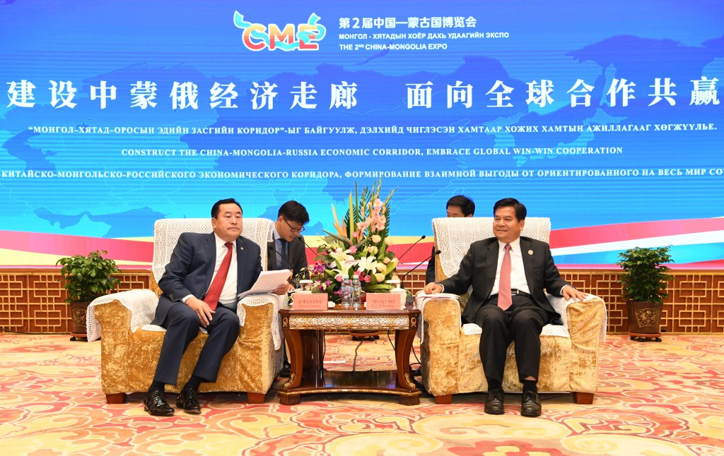 亲自出席第二届蒙中博览会开幕仪式的蒙古国大呼拉尔副主席桑吉米亚特布在呼和浩特会见中国内蒙古自治区党委书记、人大常委会主任李纪恒。
