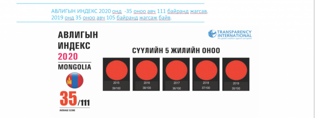 在全球180个国家和地区中,蒙古国得分35分,比2019年退步5份,排名第111位。