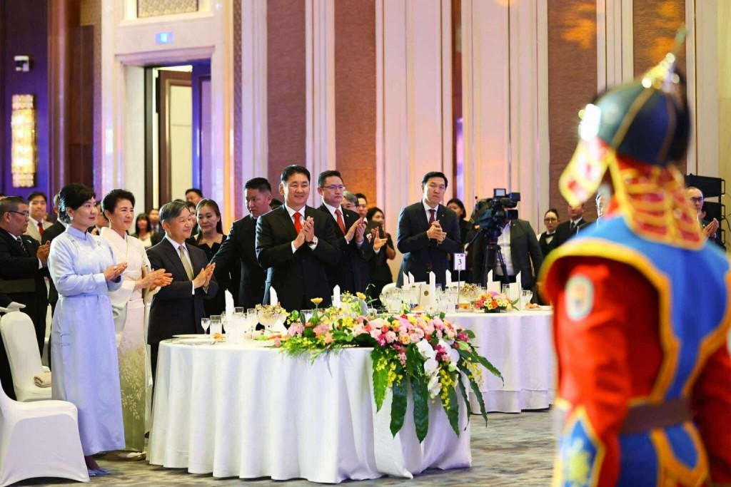つづいて、天皇陛下が答礼のおことばを述べられた。 「天皇陛下おことば フレルスフ大統領閣下、ボロルツェツェグ夫人 御列席の皆様、 ター・ブフンテェ・ダヒン・オールズスンダー・タータェ・バェン(皆様との再会を嬉しく思います)。 私は2007年にモンゴルを初めて訪問しましたが、その時の経験は大変印象深く、宝物となっています。また、今回は日本の天皇として初のモンゴル訪問であり、両国の一層の友好関係の増進につながることを願うとともに、国民的祭典であるナーダムの開会式に出席する機会を頂いたことを、大変有り難く思います。また、この度、フレルスフ大統領の御発意により、ナーダムの開会式が行われる7月11日が、国連の場において「世界馬の日」となったことは意義深いことと思います。 一昨日に当地に到着しましたが、経済発展等に伴い、前回訪問時よりも更にモンゴル社会全体に力強さを感じるとともに、深い蒼天の下、競うように草木が芽吹き、美しい花を咲かせると表現される、最も麗しい季節に皇后と共に貴国を訪問できたことを嬉しく思っております。 また、前回訪問時に雨が降った際、モンゴルでは雨が降るのは非常に縁起が良いとの言い習わしがあると聞き、乾燥地帯で暮らす人々にとっての水の大切さを実感しました。昨日、私は、ウランバートル上下水道公社とガチョールト水源を視察しましたが、両国の人々が協力し、大切な水資源の安定的確保という課題に取り組んでいる姿に、感慨を覚えました。そして、ガチョールト水源は幸い雨の中でした。日本が1995年の阪神・淡路大震災、2011年の東日本大震災、そして2024年の能登半島地震などの大きな災害に見舞われたとき、モンゴルの人々はすぐさま支援の手を差し伸べてくれました。私たち日本人を勇気付けていただいたモンゴルの方々の温かい気持ちを、私たちは決して忘れません。両国間の交流や協力の可能性は、モンゴルの大草原のように、果てしなく広がっています。本日のすばらしい宴を催していただいたフレルスフ大統領及びボロルツェツェグ夫人に感謝申し上げるとともに、ここに杯を挙げ、大統領御夫妻、両国国民の御健勝と御多幸、そして、日・モンゴル関係の一層の発展を心から祈ります。 ザー・ホンダガ・ウルグイー(では、乾杯しましょう) ター・ブフン・サエハン・ナーダーラエー(ナーダムを楽しみましょう)」 陛下のご発声で、全員で再び乾杯が行われた。