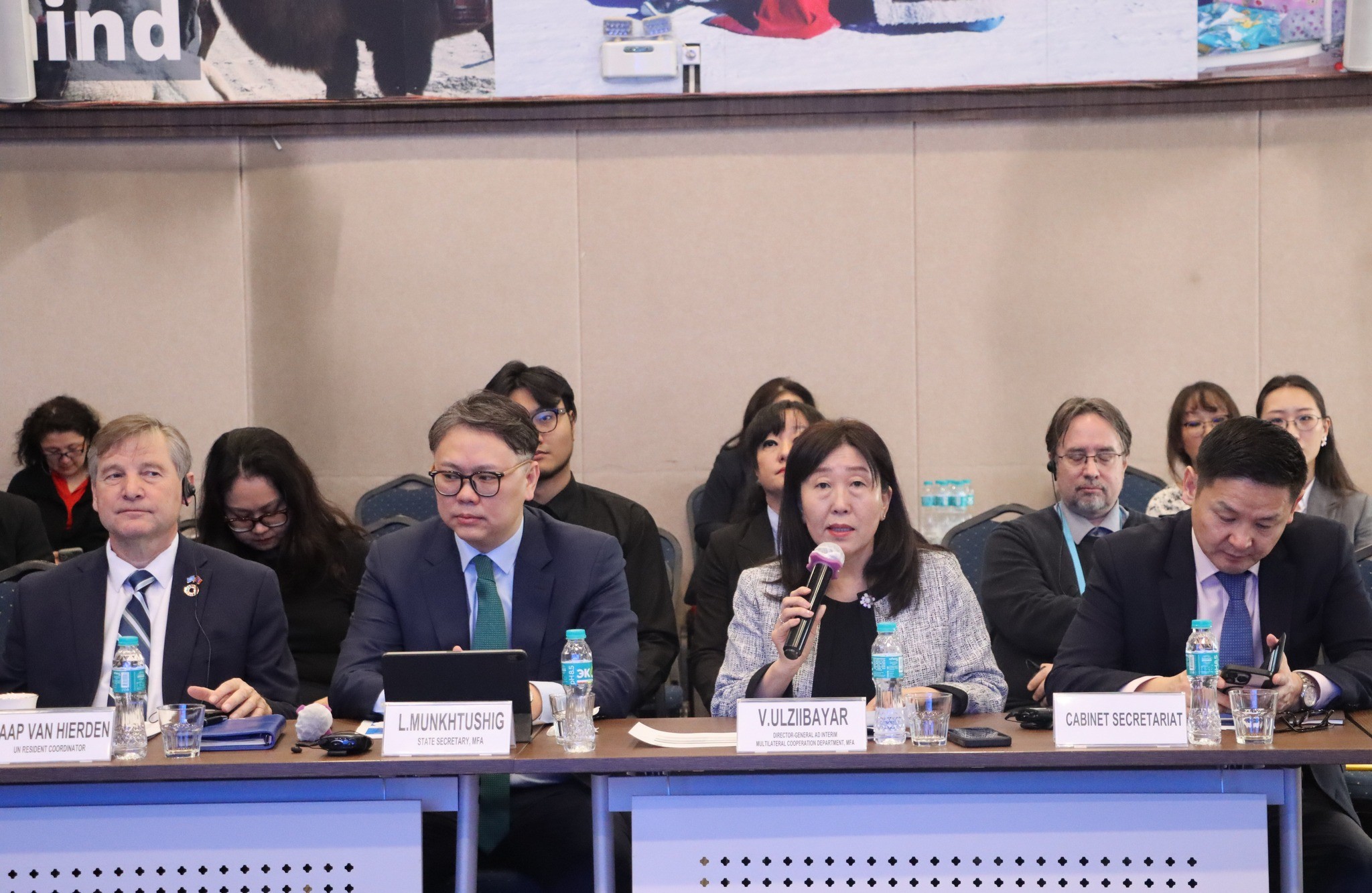 Хурлыг Гадаад харилцааны яамны Төрийн нарийн бичгийн дарга Л.Мөнхтүшиг, Эдийн засаг, хөгжлийн яамны Тогтвортой хөгжил, нийгмийн бодлогын хэлтсийн дарга П. Чандмань болон НҮБ-ын Суурин зохицуулагч Яап ван Хиердэн нар хамтран удирдав.