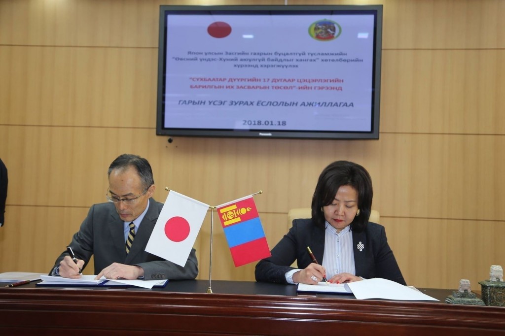 在モンゴル日本大使の高岡正人氏とスフバータル区のボロルマー区長らが1億7300万トゥグルグの無償援助契約書に署名した...