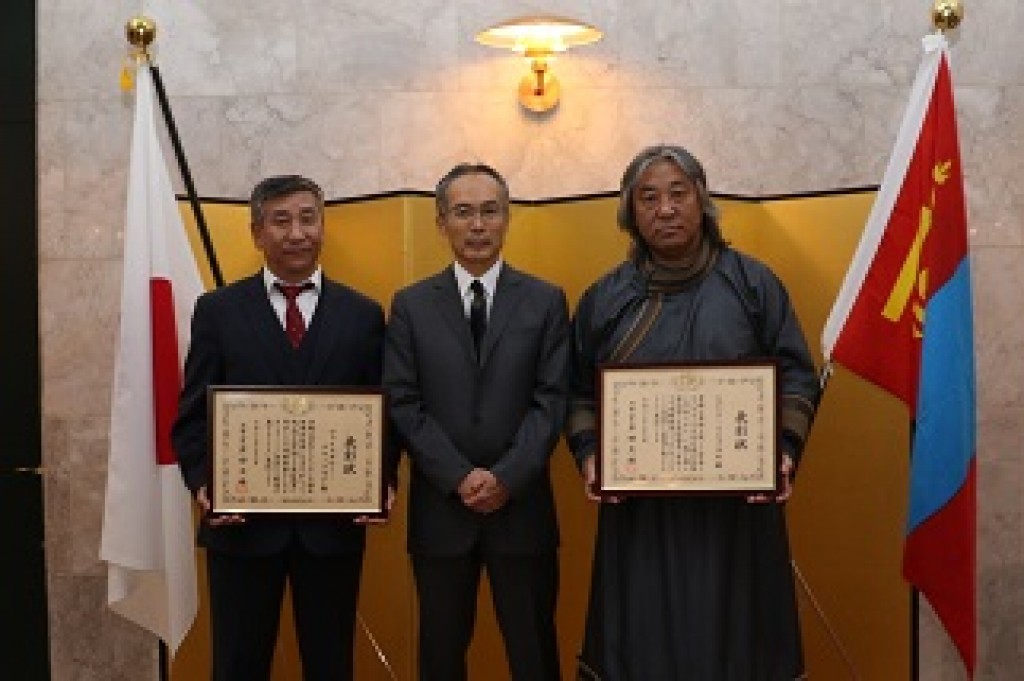 俳優のソソルバラムさんとモンゴル日本人材開発センターのダワードルジ所長が日本外務大臣表彰を受賞した