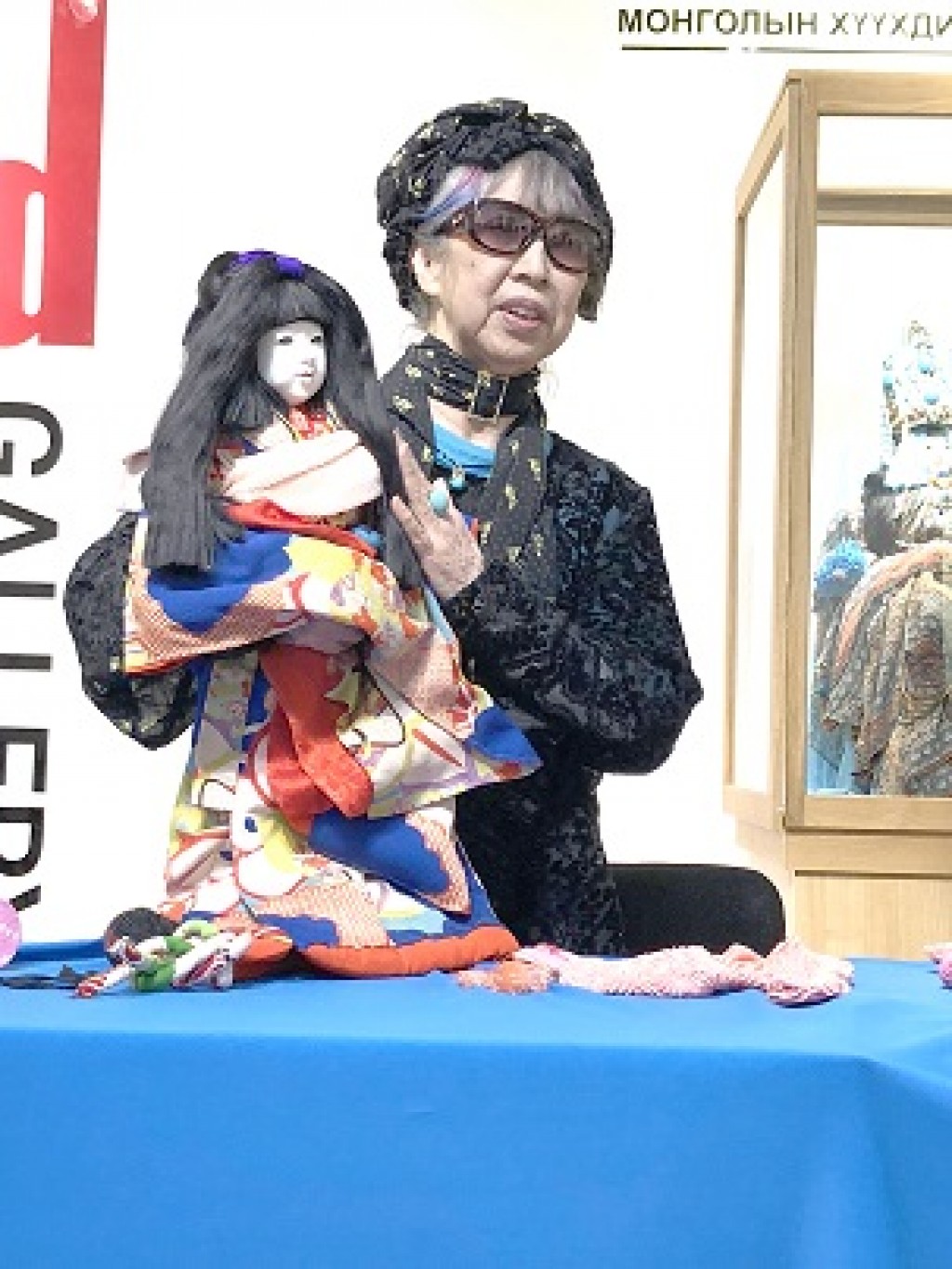 モンゴルの子どもたちに日本人形に衣装を着付けする実演を見せた