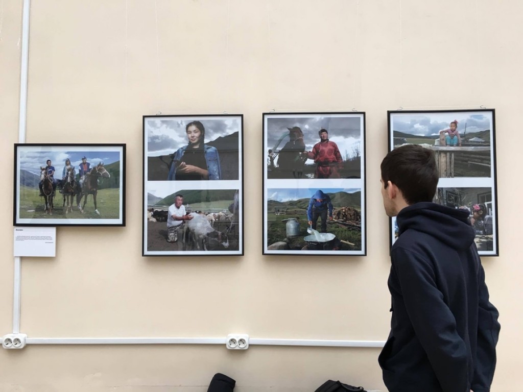 モスクワ大学の写真展にモンゴルの生活を見せた写真が展示されている