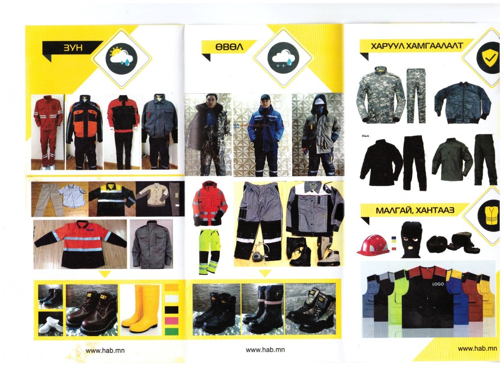 労働者の安全を確保するための基本条件の 1 つは、特殊作業服と安全保護具の使用を義務付けることであり、これらを使用することで労働災害、事故、潜在的リスクが発生しない環境が整う。スタイン・イヘル・ツェツェグ社は 1993 年に設立されてから、個人、家業から鉱山業、警備まで工業、サービス業などあらゆる分野に労働衛生保護具、作業靴、作業服を注文製造し、供給してきた会社である。当社は国際基準に適した作業着の製造に加え、韓国からはガス機器及び食品機器を輸入している。スタイン・イヘル・ツェツェグ社によれば、海外からの注文、さらなる協力を歓迎するとのこと。