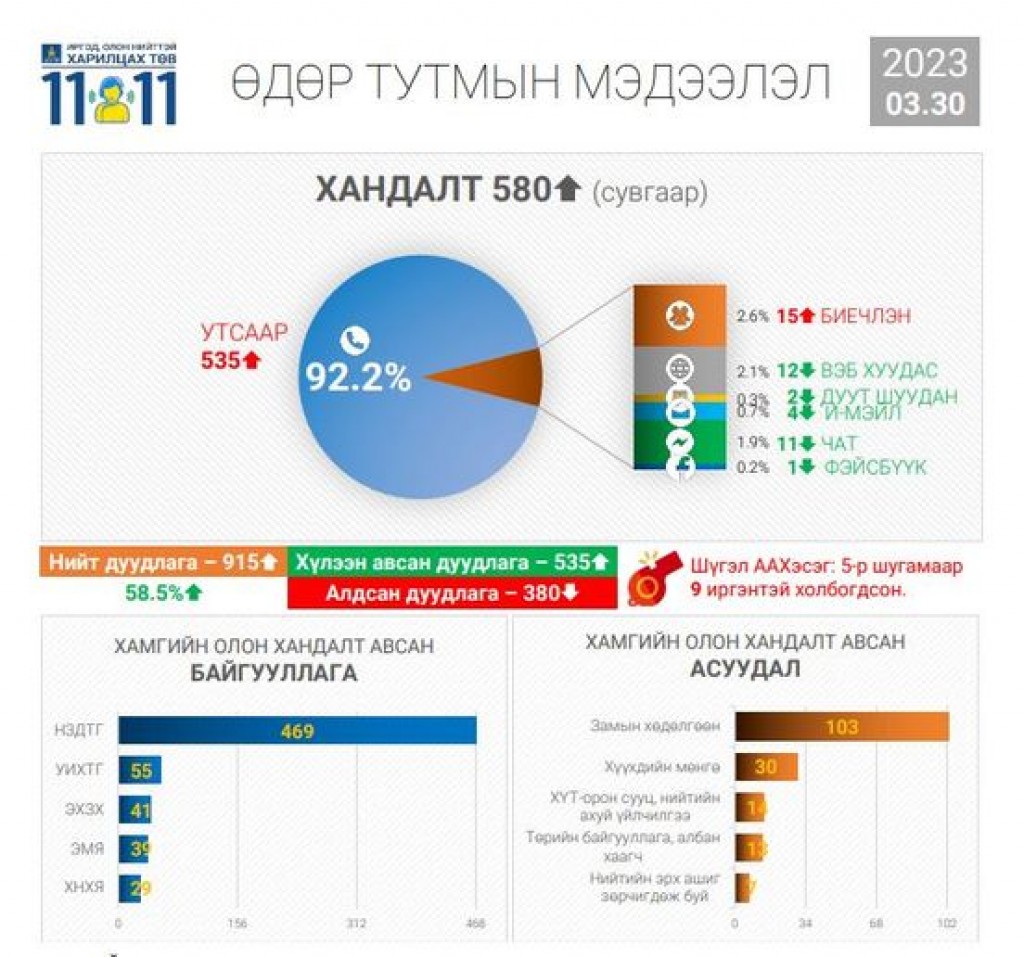 10日、政府が実施している「腐敗・汚職対策」の一つである「ホイッスル吹き作戦」作業部会が11-11行政苦情コールセンターで対応し、腐敗や汚職に関する内部告発や密告情報を収集した。ソロンゴ法務・内務副大臣は「国民は土地、行政サービスの手続きに関する不満が多いため、私たちは国民と民間部門の立場から課題解決に向け情報を収集、分析し、意思決定に反映させるよう取り組んでいます。同作戦の実施に国民の参加や支援が必要である。もし、犯罪性質を有する情報が共有された場合、汚職対策局に報告する。また、同省は行政機関及び役所関連者による苦情解決に関する法律の一部改正法案を検討している」と述べた。エルへムバータル電子開発通信副大臣は「E-Mongoliaアプリ、郵便局で情報や文書を受け取る郵便箱を設置するなど情報収集用の特定チャンネルを作成すべきだ。同省は全分野におけるデジタル化促進の枠で、行政機関サービスの電子形態移行を目指している。官僚主義と腐敗防止にはデジタル化が重要」と主張した。作業部会は毎週金曜日の午前9時~12時に同コールセンターで対応し、国民から情報を収集する。