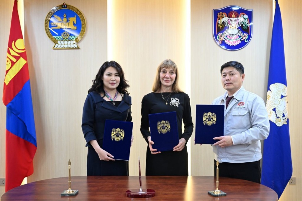 「再生可能エネルギー導入支援によるゲル地区の生活の向上」プロジェクト実施にあたり、H.ニャムバータル・ウランバートル市市長、マチルダ・ディモフスカ、国連開発計画(UNDP)モンゴル常駐代表、ならびにG.ガンガムレンUlaanbaatar Investment and Management UCC有限会社の最高経営責任者が覚書に署名した。
