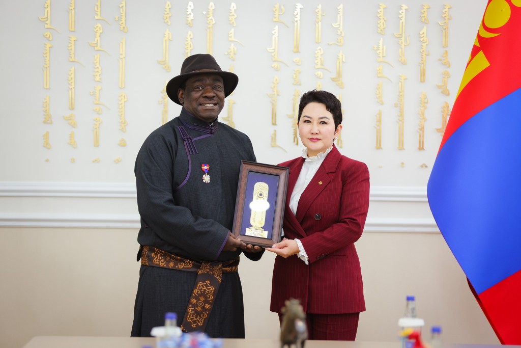 会談の締めくくりとして、バトツェツェグ外相は、エバリスト・コムラン常駐代表の今後の活躍を祈念し、外務省の「ゴールデン・ゲレゲ」を贈呈した。