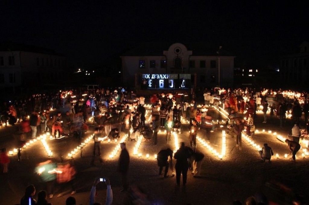 Сүхбаатарын талбайн эргэн тойрны гэрэл унтарч, лаа гэрэлтэнэ.