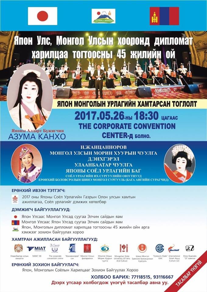 Монгол, Япон улс хооронд дипломат харилцаа тогтоосны 45 жилийн ойг тохиолдуулан хоёр орны уран бүтээлчид хамтарсан тоглолт хийх юм.