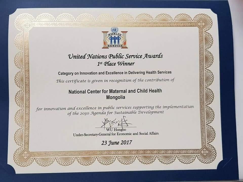 Эх хүүхдийн эрүүл мэндийн үндэсний төв Монгол Улсаас анх удаа Нэгдсэн үндэсний байгууллагаас олгодог шагналыг хүртлээ.