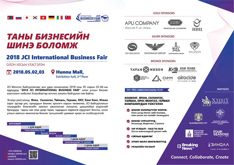 “JCI 2018 INTERNATIONAL BUSINESS FAIR’’ олон улсын бизнес үзэсгэлэн 5-р сарын 2-4-нд Улаанбаатар хотноо зохион байгуулагдана. Дэлхийн хэмжээнд залуу удирдагчид, ажил хэрэгч хүмүүсийн сайн дурын үндсэн дээр үйл ажиллагаа явуулдаг JCI байгууллагаас анх удаагаа энэхүү олон улсын бизнес үзэсгэлэнг зохион байгуулах гэж байна. “Хүннү молл”-д болох уг үзэсгэлэнд Монгол, Япон, Солонгос, Тайвань, Хонг Конг, Герман, ОХУ, Италийн аялал жуулчлал, хууль эрх зүй, санхүү, барилга, уул уурхай, мэдээллийн технологийн чиглэлээр үйл ажиллагаа явуулдаг 100 гаруй компани оролцож, бүтээгдэхүүн үйлчилгээгээ танилцуулна. Мөн үзэсгэлэнгийн үеэр олон улсын зах зээлд хэрхэн бизнес эрхлэх талаар гадны томоохон компаниудын төлөөллүүд илтгэл тавьж, бизнес сургалт, компаниудын уулзалт, Монгол үндэсний брэндүүдийг сурталчлах аялал, соёлын өдөрлөг зохион байгуулах юм байна.