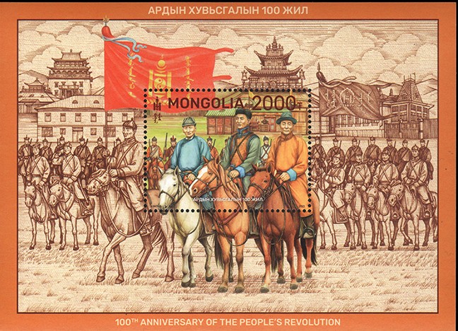 "Ардын хувьсгалын 100 жил” сэдэвт блок марканд 1921 оны Ардын хувьсгалын удирдагч, Ардын засгийн газрын тэргүүн Д.Бодоо, бүх цэргийн жанжин Д.Сүхбаатар, МАН-ын Төв Хорооны дарга С.Данзан нарыг морьтойгоор дүрсэлсэн байна. Блокны чимэглэл хэсэгт Ардын журамт цэргүүд хүрээнд орж ирсэн үе, Монгол Ардын намын журамт цэргийн жанжин туг, Ардын журамт цэргийн туг, дун үлээж буй морьт цэрэг, Богд хааны төрийн Шар ордон, Мэгжид Жанрайсиг бурхны сүм, Өндөр хоршоо, МАН-ын төв хороо, Ардын Түр Засгийн газар, Бүх цэргийн штаб байрлаж, жанжин Д.Сүхбаатар ажиллаж байсан байр зэргийг дүрслэн харуулжээ.