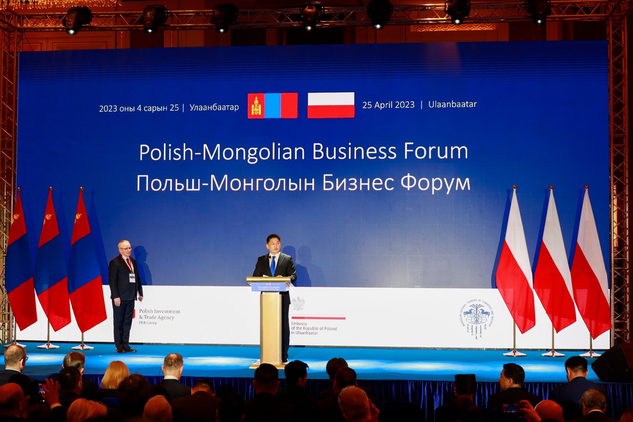 "Сүүлийн жилүүдэд манай хоёр орны харилцаа улс төр, батлан хамгаалах боловсрол, нийгмийн хамгаалал болон худалдаа эдийн засгийн салбарт идэвхтэй өргөжин хөгжиж хоёр талын худалдааны эргэлт жил ирэх тусам нэмэгдэж байна. Тухайлбал сүүлийн 3 жилийн хугацаанд манай хоёр орны худалдааны эргэлт 2 дахин өссөн байна. Энэ бол маш сайхан үзүүлэлт. Хоёр улсын худалдаа, эдийн засгийн хамтын ажиллагааг өргөжүүлэх үүднээс Монгол Улсын Засгийн газар, Бүгд Найрамдах Польш улсын Засгийн газар хооронд Олон Улсын авто тээврийн харилцааны тухай хэлэлцээрийг энэхүү айлчлалын үеэр байгууллаа. Уг хэлэлцээр нь бизнес эрхлэгчдийн хамтын ажиллагааг өргөжүүлэхэд чухал алхам болно гэж үзэж байна. Далайд гарцгүй манай улсын хувьд худалдаа болон дэмжин өнгөрөх тээврийн өртөг зардал буурах, цаг хугацааг хэмнэх зэрэг олон эерэг үр дүнг авчрах болно. Шинэ эргэлтийн бодлогын хүрээнд улсынхаа дэд бүтцийг сайжруулах, эрчим хүчний шинэ эх үүсвэрийг нэмэгдүүлэх, аж үйлдвэржилт, хот, хөдөөгийн хөгжил, аялал жуулчлал, ногоон хөгжил болон цахим хөгжлийн асуудлыг эдийн засгийн тэргүүлэх чиглэлд тодорхойлж, төр, хувийн хэвшлийн түншлэлд тулгуурлан хэрэгжүүлэхээр зорин ажиллаж байна. Энэ хүрээнд хоёр улсын хамтын ажиллагааг уул уурхай, соёл боловсрол, байгаль орчин, банк санхүү, цахим худалдаа, хөдөө аж ахуйн салбарт өргөжүүлэн хөгжүүлж, харилцан ашигтай томоохон төсөл хөтөлбөрийг хамтран хэрэгжүүлэх шинэ боломж нээгдэж байна. "Монгол Улс эдийн засгаа сэргээх бодлогын хүрээнд хоёр хөршөөс гадна гуравдагч хөршийн оролцоог нэмэгдүүлж, эдийн засгаа төрөлжүүлэх, олон тулгуурт тогтвортой бүтцийг бий болгохоор зорин ажиллаж байгаа. Эрхэм хүндэт та бүхнийг Монгол Улсад ирж, бизнес эрхэлж, хөрөнгө оруулж, монголчууд бидэнтэй харилцан ашигтай ажиллахыг уриалж байна гэсэн юм.