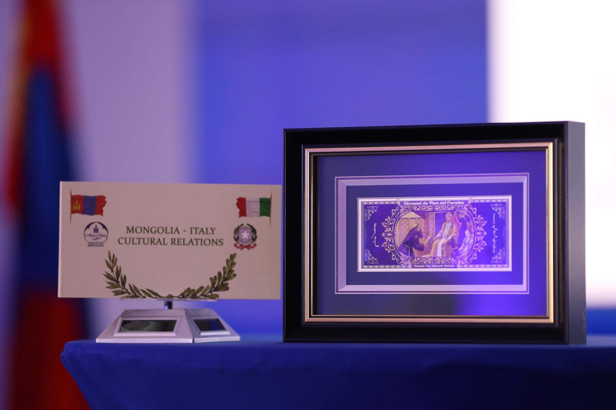 Мөн түүхэн айлчлалыг угтан Монголбанк, Бүгд Найрамдах Итали Улсаас Монгол Улсад суугаа Элчин сайдын яам хамтран “Монгол-Итали” дурсгалын ялтсан зоосыг гаргалаа. Ромын Пап IV Инносент энх тайвныг хүсэн Монголын их хаан Гүюгт бичсэн захидлыг дипломат элч Плано де Карпини гардуулж байгааг зоосонд дүрсэлсэн байна. Их хаанд бараалхаж байгаа энэ мөчийг Италийн зураач Жерардо Доттори зурсан бөгөөд 1949 онд Плано де Карпинигийн төрөлх нутаг Мажионэ хотын захиргааны зөвлөлийн танхимын хананд мөнхөлсөн байдаг.Дурсгалын зоос 5 грамм жинтэй, 999.9 сорьцтой цагаан мөнгөн ялтсан зоос бөгөөд 150х65 мм хэмжээтэй юм.