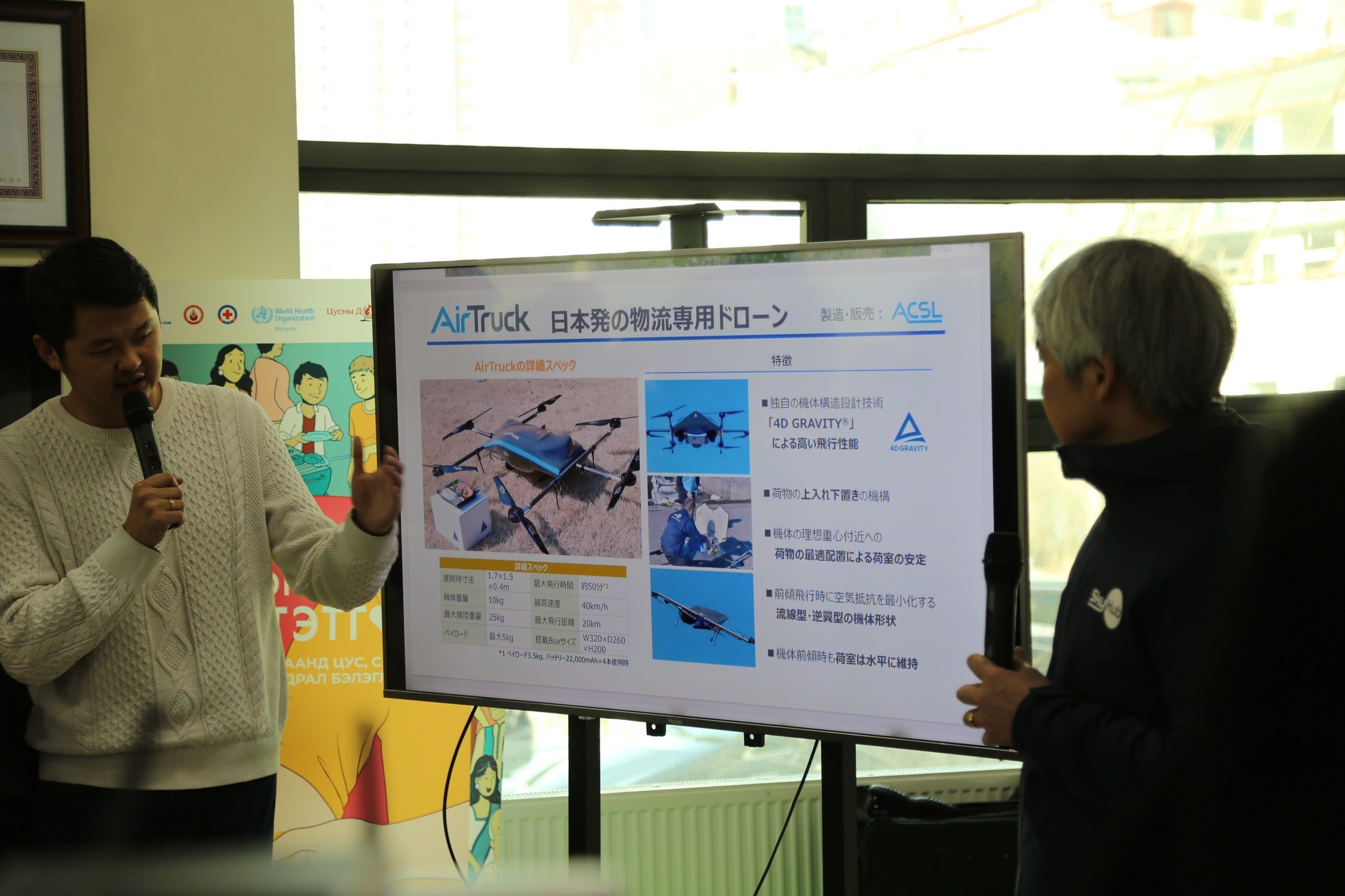 Иймд цус, цусан бүтээгдэхүүнийг хэрхэн түргэн шуурхай хүргэж болох талаар 2023 оны 9 дүгээр сарын 28-нд болсон Монгол, Японы төр, хувийн хэвшлийн байгууллагуудын хамтарсан “Шинэ үеийн ухаалаг тээвэрлэлт Монголд” симпозиумын үеэр ярилцсан байна. Үүний үр дүнд Монголын шинэ үеийн ухаалаг ложистикийг дэмжих Монгол-Японы хамтарсан ажлын хэсгийг байгуулж талууд санамж бичигт гарын үсэг зурсан юм. Тус хамтын ажиллагааны үр дүнд Улаанбаатар хотод дрон ашиглан эмнэлэг хооронд цус тээвэрлэх туршилтын үйл ажиллагааг 2023 оны 11 дугаар сарын 13-нд хийлээ. Тодруулбал, Цус сэлбэлт судлалын үндэсний төвөөс АШУҮИС-ийн Монгол-Японы эмнэлэг хүртэлх нийт 4,75 км зайд “AirTruck” буюу тусгай ложистикийн дрон ашиглан ачааг тээвэрлэх анхны туршилтыг амжилттай хийж гүйцэтгэсэн юм. Энэхүү тусгай ложистикийн дрон нь 5 кг буюу 15 нэгж цус цусан бүтээгдэхүүнийг цагт 36 км хурдтайгаар буюу. 4,75 км зайг 12 минутад туулсан юм. Туршилтын үеэр бид Цус сэлбэлт судлалын үндэсний төвийн захирал АУ-ны доктор Н. Эрдэнэбаяртай уулзсан юм.
