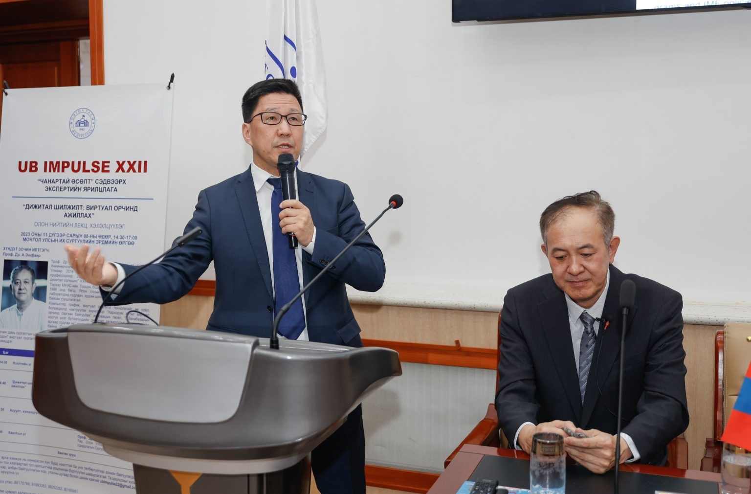 А. Энхбаяр: Аж үйлдвэрийн шинэ эрин эхэлж байна. Энэ эриний гол өөрчлөлтийг дижитал шилжилт гэж яриад байна. Дижитал шилжилт гэдэг ойлголт нь ерөнхийдөө 10 гаран технологи дээр суурилж бий болж байгаа юм. Та бүхний сайн мэдэх хиймэл оюун ухаан, янз бүрийн дижитал технологиуд, интернэт, 5G гээд л өчнөөн технологиуд байна. Энэ бүгдийг зэрэг хөгжүүлэх боломж хязгаарлагдмал байна. Бид нарын гол зорилго бол метаверс, виртуал реалити гэх мэт виртуал технологиудын тухай ойлголтыг олон нийтэд хүргэх. Эдгээр технологийг хөгжүүлээд түүх өв соёлыг залуу үедээ арай шинэлэг байдлаар хүргэх, боловсролын хүртээмжийг дээшлүүлэх чиглэлээр ажиллаж байна. Миний хувьд энэ удаагийн илтгэлээрээ виртуал технологи гэж юу вэ? хэрхэн ашиглахад вэ? ямар давуу талтай вэ? дэлхий ер нь хаашаа яваад байна вэ гэдгийг энгийн байдлаар тайлбарлаж өгнө. Виртуал орчинд ажиллах чадварыг дунд сургуулийн хүүхдүүд, оюутнууд илүү сайн эзэмшиж байна. Учир нь тэд виртуал орчинд ороод янз янзын тоглоом тоглож байна. Мөн виртуал орчинд ганцхан хүн тоглох биш сурах, ажил хийх, музей үзэх зэргээр бодит амьдрал дээр ашиглах боломжтой гэдгийг ойлгож эхэлж байна. Дэлхий нийттэй харьцуулахад манай улс ямар түвшинд явж байна гэж асуулаа. Дэлхий бол асар хурдтай хөгжиж байна. Манай улсын хувьд энэ хөгжлийн хурднаас нээх хол хаягдаагүй ямар ч байсан дэлхий хаашаа явж байна бид тийшээ явж байгаа. Бидний гол зорилго бол дэлхий нийт ингэж хурдацтай хөгжиж байхад бид хоцорч болохгүй ядаж зэрэгцээд явах хэрэгтэй гэдэг үүднээс чадах ядахаараа хөгжүүлээд явж байна. Жишээ нь Монголын анхны түүх соёлын “Гүег” метаверс гэдгийг байгууллаа. Дэлхий дээр амьдарч байгаа 30 гаруй мянган хүн бүртгүүлж ороод түүх соёлтой танилцаж, музей үзэж болж байна. Удахгүй виртуалаар сургуульд сурч ажиллах боломжтой болно гэх мэт иймэрхүү зүйлийг хийгээд явж байна.