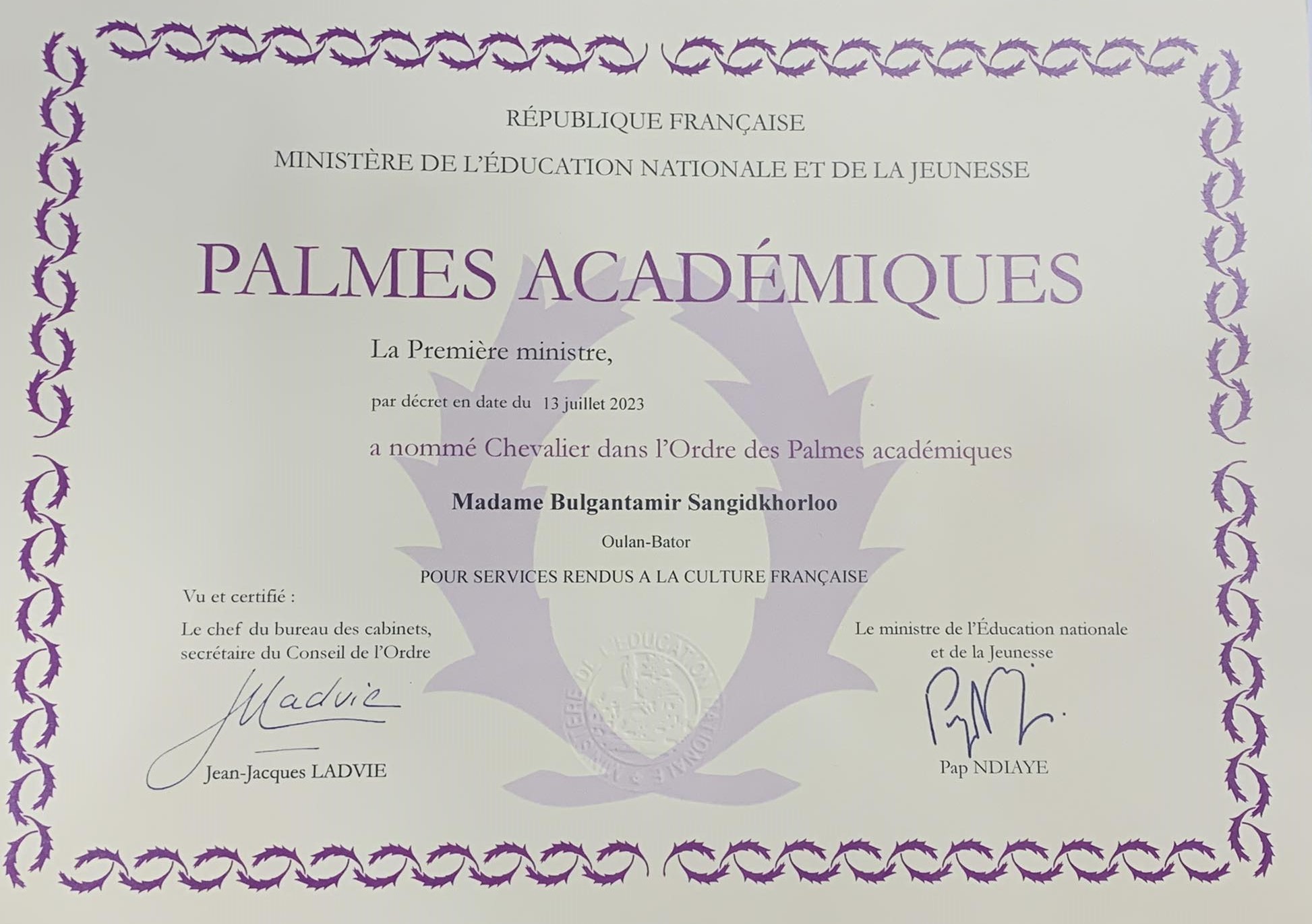 Монгол улсад франц хэл зааж эхэлсний 60 жилийн ой болон олон улсын франц хэлний багш нарын өдрийг тохиолдуулан Францын Боловсролын яамнаас МУИС -ийн Европ судлалын тэнхимийн профессор, франц хэлний багш Б.Алтангүлыг “Эрдмийн далдуу модны офицер” цолоор, МУИС-н сургалт, хөтөлбөр чанарын баталгаажуулалтын бодлогын газрын дарга, франц хэлний багш С.Булгантамир болон МУИС-ийн Европ судлалын тэнхимийн профессор Л. Дорждэрэмийг “Эрдмийн далдуу модны хүлэгт баатар” цолоор тус тус шагнасан юм. Энэхүү шагналыг 1808 онд Францын эзэн хаан Напалеон Бонапард анх санаачилсан түүхтэй бөгөөд боловсрол, соёл, шинжлэх ухааны салбарын шилдэг мэргэжилтнүүдэд гардуулдаг аж. Бид Эрдмийн далдуу модны офицер цолоор шагнуулсан профессор Б.Алтангүлтэй уулзаж сэтгэгдлээс нь хуваалцсан юм. Тэрээр 1990 онд МУИС-ийн Франц хэлний ангид элсэн орсноосоо хойш 30-аад жил тасралтгүй франц хэлийг зааж, түгээн дэлгэрүүлэх үйлсэд хүчин зүтгэж яваа багш юм.