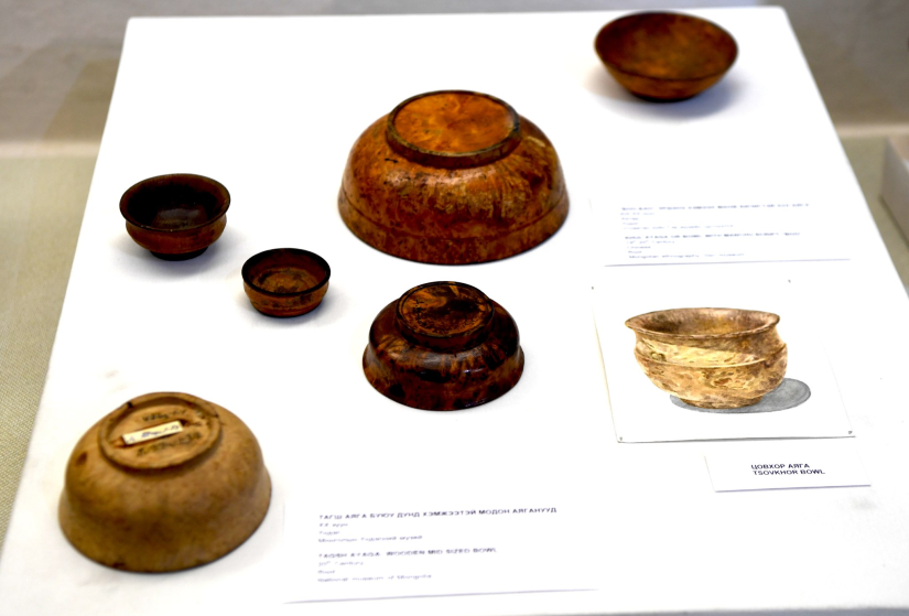 Монгол улсын музейд түүхийн аль ч цаг үед холбогдох, олон төрлийн материал ашиглан урласан хэдэн зуун аяга хадгалагдаж байна. Үүнд УГЗ, дархан Ш.Гүндийн 1946 онд урлаж, маршал Х.Чойбалсанд дурсгасан мөнгөн аяга, маанийн үсэгтэй гавал аяга, тахилын цар таваг, "Боо-Бао" эрдэнэ хэмээх манж бичигтэй хул аяга зэргийг дурдаж болно. Маршал Х.Чойбалсанд дурсгасан мөнгөн аяганы бөөрийг товойлгосон нэгэн ижил хэмжээтэй 24 бад зээ, 12 жилийн хооронд монгол бичгээр "6 дугаар хорооны ардуудаас Улсын шалгарсан маршал Чойбалсангийн 50 насны ойд дурсгав" хэмээн товойлгон бичсэн байдаг ажээ. Мөн Монгол төрийг 40 жил удирдсан Юмжаагийн Цэдэнбал даргын хэрэглэж байсан гурван хос болор, мөнгөн таваг, хаан, хатан сүйхтэй хос халбага, сэрээ өдгөө хүртэл хадгалагдсаар байгаа юм. Эдгээр баримтаас үзэхэд нүүдэлчин монголчууд аяга хэмээх хэрэгслийг төрөл бүрийн зүйлээр урлаж, ур хийцийг нь улам төгөлдөржүүлсэн нь харагдаж буй гэж судлаач С.Бадрал хэллээ.