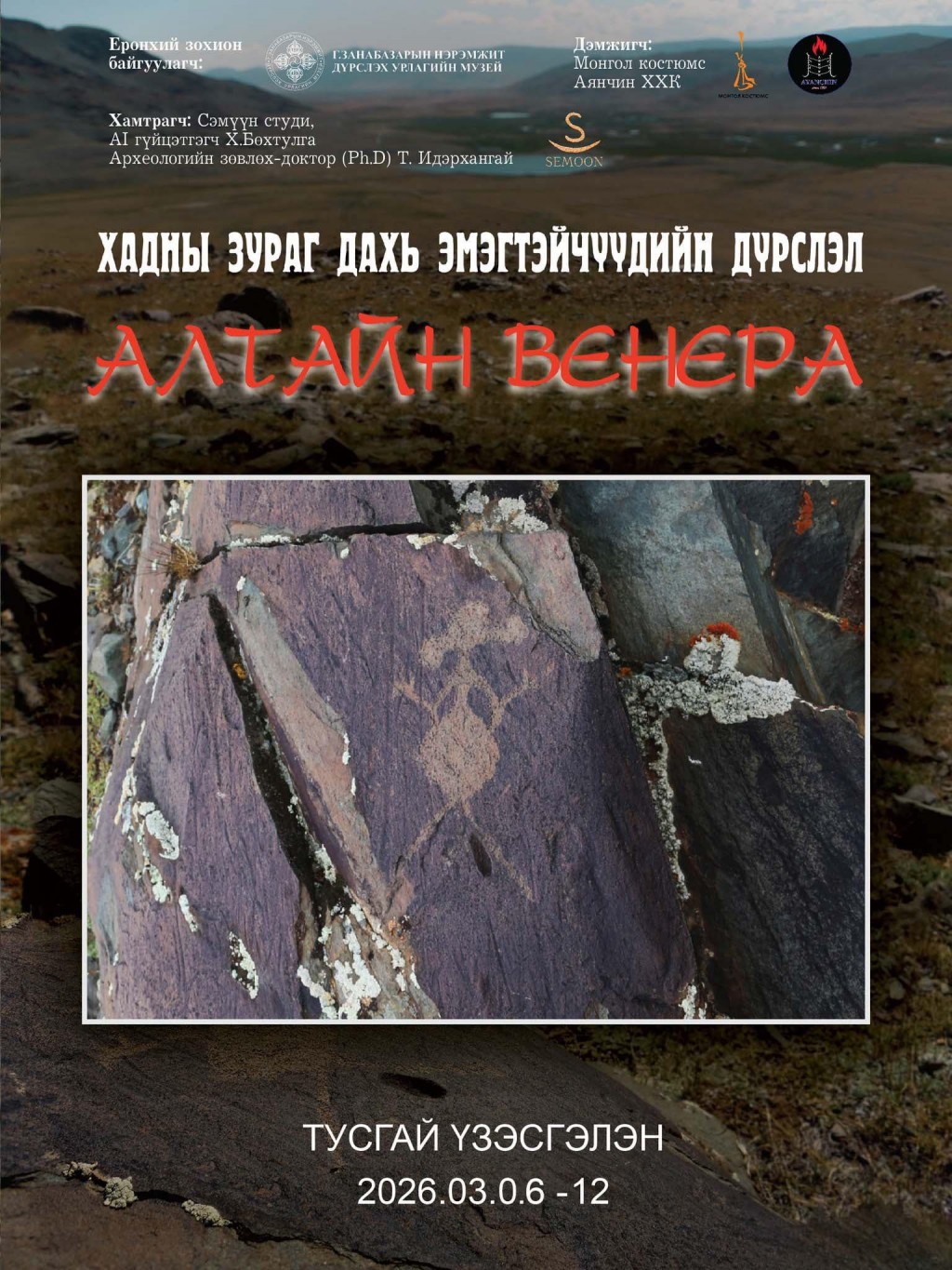 Монголын эртний хадны зурагт эмэгтэйчүүдийг хэрхэн дүрсэлснийг сонирхуулсан гэрэл зургийн үзэсгэлэн Г.Занабазарын нэрэмжит Дүрслэх урлагийн музейд гарч байна. Тус музей 2001 оноос хойш жил бүр зохион байгуулж ирсэн “Бүсгүйчүүдийн дүр дүрслэх урлагт” үзэсгэлэнг энэ удаад найруулагч, “Сэмүүн” студийн захирал Б.Баяр, уран бүтээлч Х.Бөхтулга, археологич Т.Идэрхангай нартай хамтран “Алтайн Венера” нэрээр ийнхүү олны хүртээл болгож байгаа юм. Үзэсгэлэнг нээж Г.Занабазарын нэрэмжит Дүрслэх урлагийн музейн захирал, Урлаг судлалын ухааны доктор П.Байгальмаа хэлэхдээ, “Бүсгүйчүүдийн дүр дүрслэх урлагт” үзэсгэлэн өдгөө урлагийн орчинд өөрийн гэсэн өнгө төрх, брэнд болсон уламжлалт үзэсгэлэн болоод байна. Тухайлбал, “Буддын шашин дахь эмэгтэй дүрслэл” гэсэн сэдвээр музейн сан хөмрөгт хадгалж буй бүтээлүүдийг дэлгэн үзүүлж байсан. Энэ үеэр шашны урлагт эмэгтэй дүр хэрхэн илэрхийлэгддэгийг харуулсан Цагаан Дарь эх, Ногоон Дарь эх, Янжинлхам зэрэг бурхан шүтээний дүрслэлийг онцлон танилцуулж байв. Ер нь дүрслэх урлагийн түүхийг харахад эмэгтэй хүний гоо сайхан, дүр төрхийг магтан дуулсан бүтээлүүдийг ихэвчлэн эрэгтэй уран бүтээлчид туурвисан байдаг. Тиймээс бүсгүйчүүдийн дүрийг урлагт мөнхөлж үлдээсэн олон бүтээлийн цаана эрэгтэй уран бүтээлчдийн харах өнцөг, уран сайхны илэрхийлэл ихээхэн нөлөөлсөн гэж хэлж болно. Энэ удаагийн үзэсгэлэнд хадны зураг дахь эмэгтэйчүүдийн дүр дүрслэлийг онцолж буйд оршиж байна. Монгол орны нутаг дэвсгэрт хэдэн зуун мянган хадны зураг байдаг ч эмэгтэй хүнийг дүрсэлсэн дүрслэл нь бусад ан, ахуй, зан үйлийн зурагтай харьцуулахад маш ховор байдаг. Тиймээс энэ удаагийн үзэсгэлэнд хадны зургаас олдсон, онцлог шинж бүхий эмэгтэй дүрүүдийг тусгайлан сонгон авч, нэг дор цогц байдлаар танилцуулж буйгаараа онцлогтой юм” хэмээв.