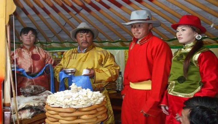 У монголов родители жениха подыскивают для него невесту, и, найдя подходящую девушку, отправляют к ней в дом сватов. Спросив согласия у родителей девушки и самой молодой, родители уже договариваются о дальнейшем проведении свадьбы.
