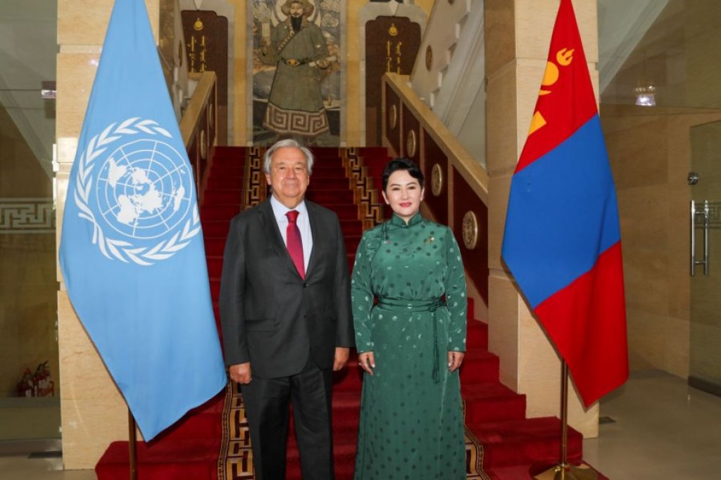 2022.08.10. Министр иностранных дел Монголии Б.Батцэцэг и Генеральный секретарь ООН Антониу Гутерриш, находящийся в Улаанбаатаре с официальным визитом, провели двустороннюю встречу и дали совместную пресс- конференцию. “Монголия, вступившая в ООН в 1961 году, является демократической страной, которая уважает права человека и считает, что женщины должны быть свободны от дискриминации. Женщины в Совете Безопасности ООН поддержат призыв увеличить число женщин, участвующих в миротворческих операциях, до 15 процентов в соответствии с резолюцией №1325. Мы проводим политику, направленную на достижение этой цели к 2027 году”, - заявила министр иностранных дел Б.Батцэцэг в своем выступлении на совместной пресс-конференции. Отметив, что в 1992 году Монголия объявила свою территорию зоной, свободной от ядерного оружия, глава МИД подчеркнула, что значение нашей страны как страны без ядерного оружия растет в то время, когда в мире сложилась напряженная ситуация с точки зрения международного мира и безопасности. По ее словам, помощь и поддержка ООН сыграют важную роль в достижении таких целей, как реформирование сферы образования, реализации программы "Цифровая нация" и превращение возобновляемых источников энергии в основной источник энергоснабжения.