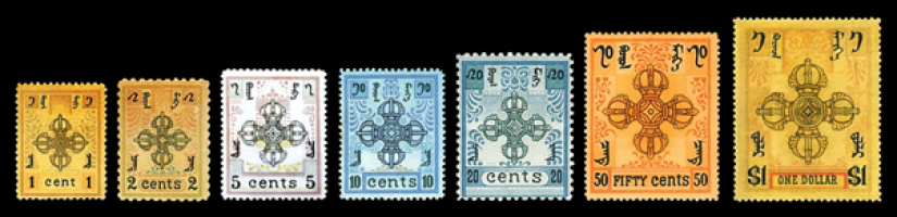 Монголия выпустила в обращение первую марку под названием "Элдэв-Очир" 1 июля 1924 года. На марках изображены две скрещённые ваджры или очиры (буддийский символ). Это символ непобедимой силы. В то время в Монголии не было еще национальной валюты, поэтому номинальная стоимость марок была выражена в долларах. В связи с уровнем развития технологий на момент выпуска этих марок цвет и размер рисунка при печати изменились.