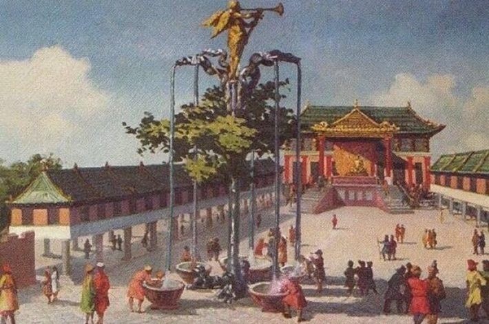 Фламандский путешественник Биллем Рубрук еще в XIII в. описал, как выглядела столица монгольской империи Каракорум, основанная Чингисханом. Особенное впечатление произвел на него ханский дворец. Он стоял на высокой платформе, в середине он напоминал корабль, а боковые его стороны были отделены двумя рядами колонн. У дворца находилось серебряное дерево с четырьмя серебряными львами у корней и змеями на ветвях. Из их раскрытых пастей лились вино и кумыс. Как свидетельствуют историки, дворец в Каракоруме строили пленники Чингисхана. Недавно раскопки в Каракоруме подтвердили эти сведения.